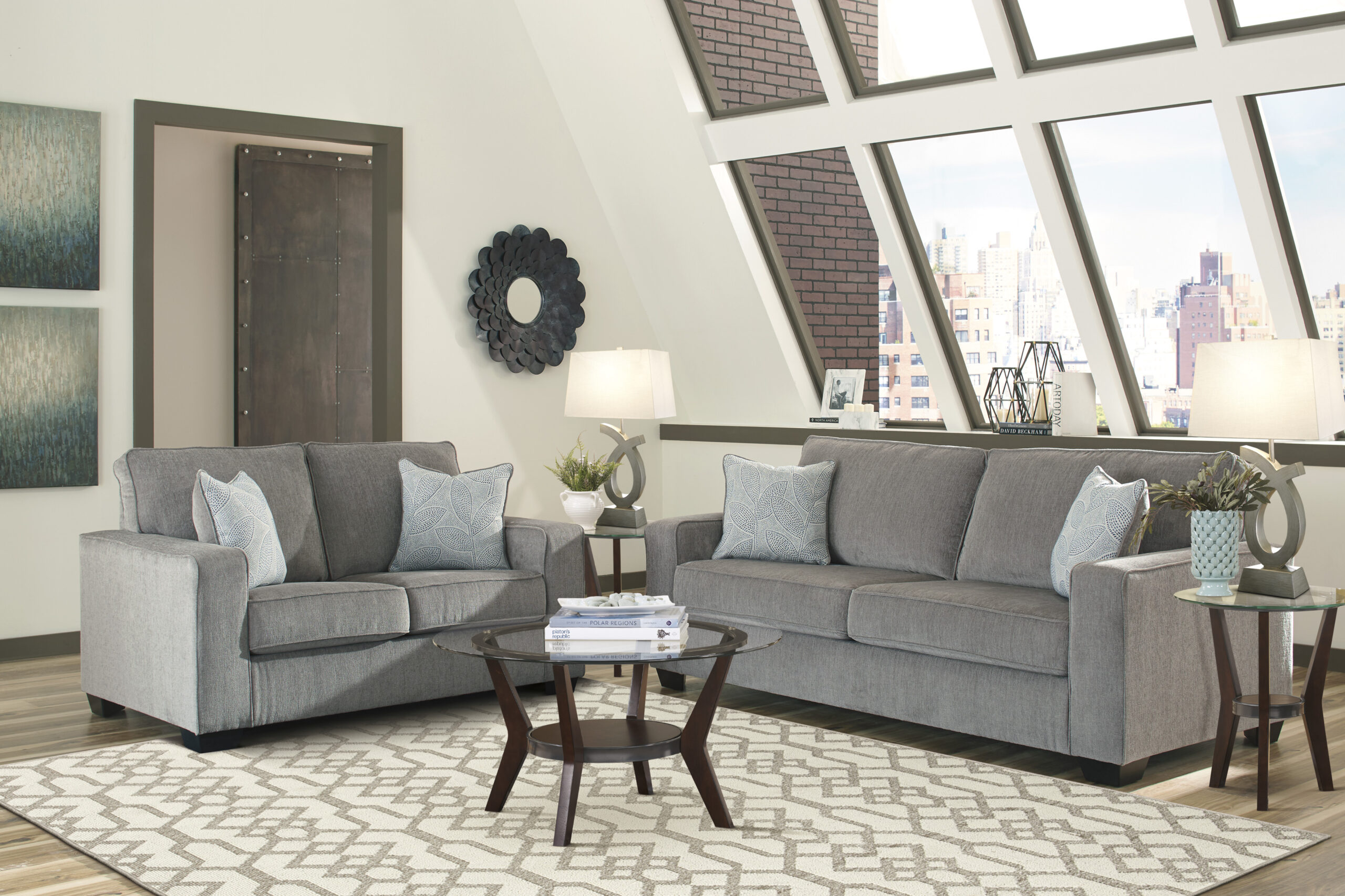 If style is the question, then this striking sofa is the answer. Sporting clean lines and sleek track arms, the decidedly contemporary profile is enhanced with plump cushioning and a chenille-feel upholstery that’s so pleasing to the touch. Sure to play well with so many color schemes, this sofa in richly neutral alloy includes a pair of understated floral pattern pillows for fashionably fresh appeal.